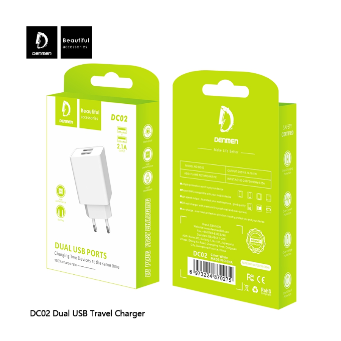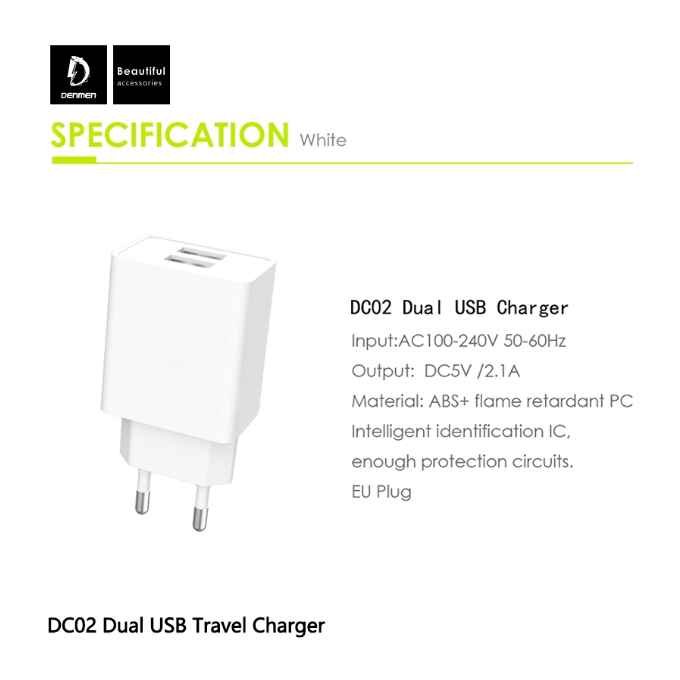 Адаптер питания сетевой Denmen DC02, 2.1А, 2 USB, 5V, пластик, черный, фирменная упаковка
