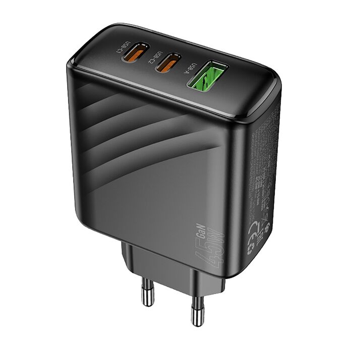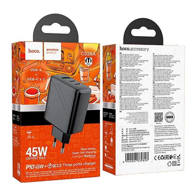 Адаптер Сетевой Hoco CS26A Article PD+QC 2Type-C/USB 3A/45W (black) (241001)