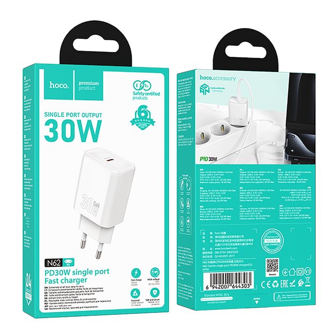 Адаптер Сетевой Hoco N62 Gentle PD Type-C 3A/30W (white) (241807)