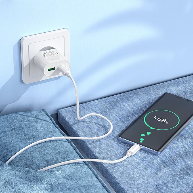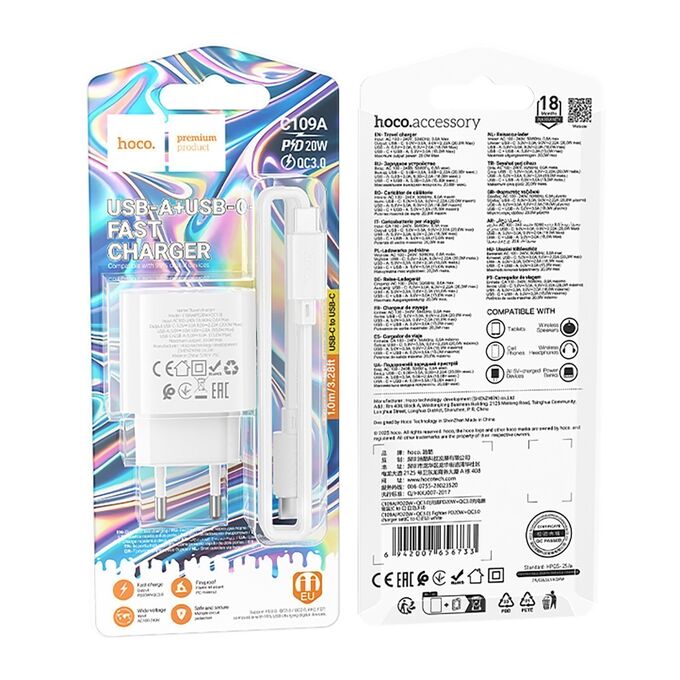 Адаптер Сетевой с кабелем Hoco C109A PD+QC3.0 USB/Type-C 3A/20W (Type-C/Type-C) (white) (242923)
