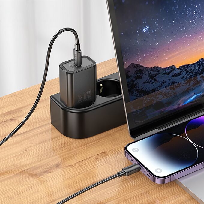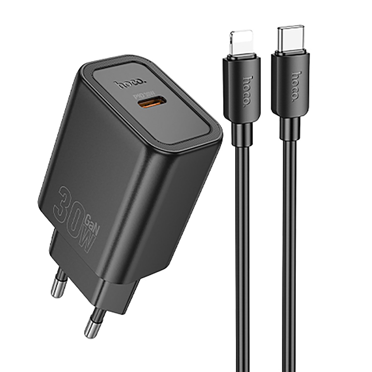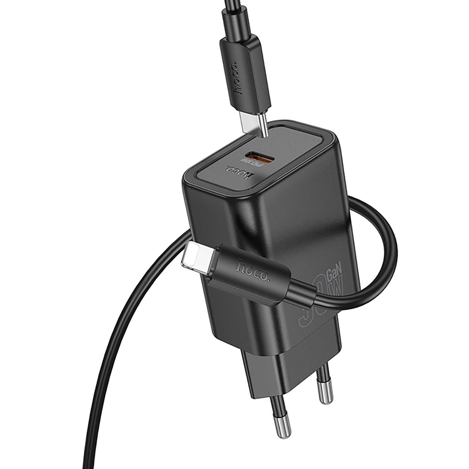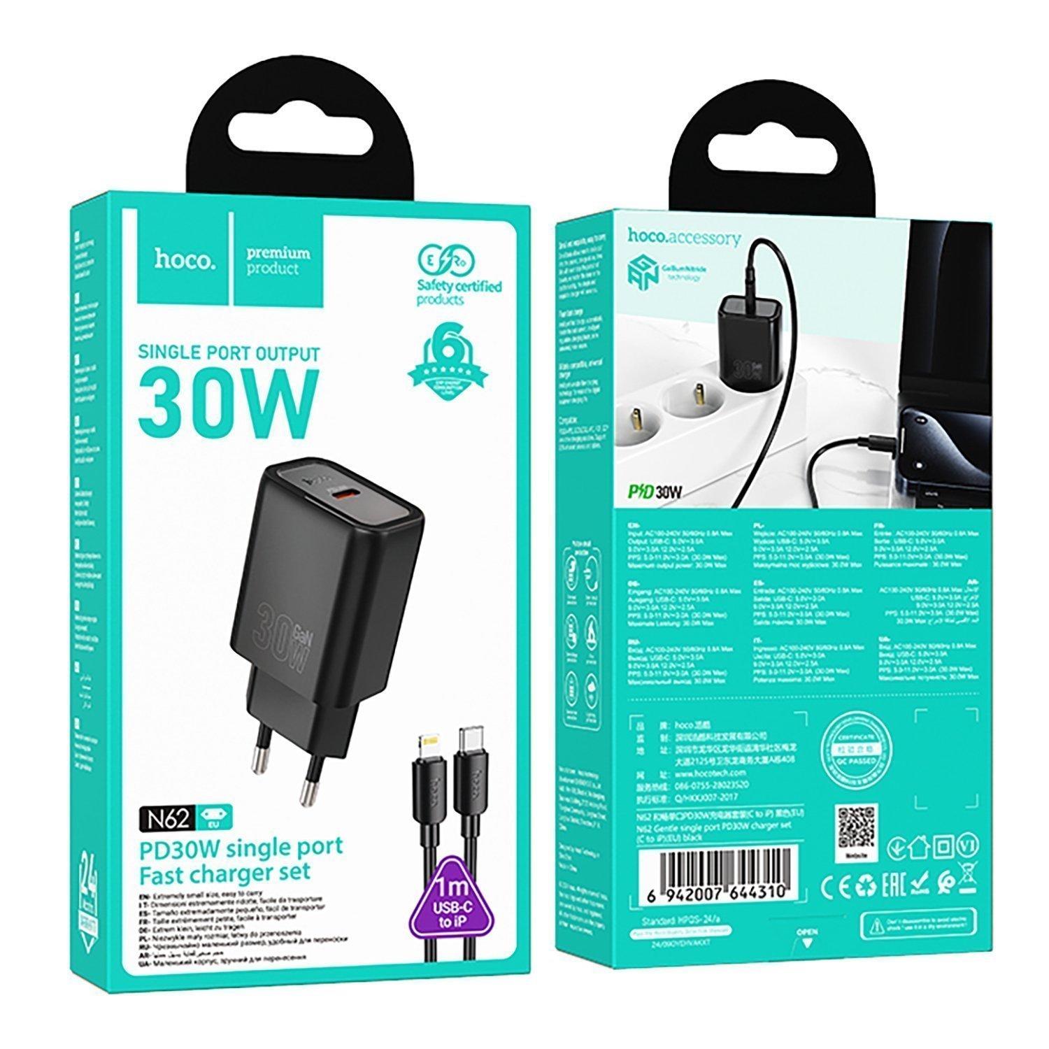 Адаптер Сетевой с кабелем Hoco N62 Gentle PD Type-C 3A/30W (Type-C/Lightning) (black) (241808)
