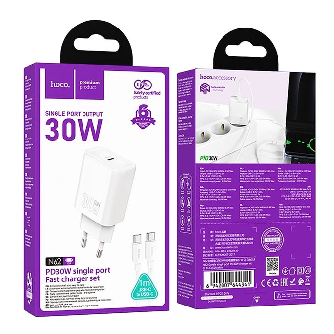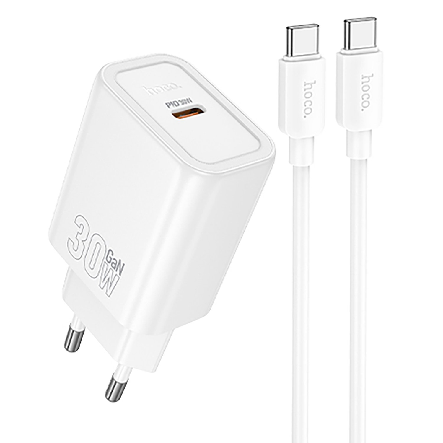 Адаптер Сетевой с кабелем Hoco N62 Gentle PD Type-C 3A/30W (Type-C/Type-C) (white) (241811)