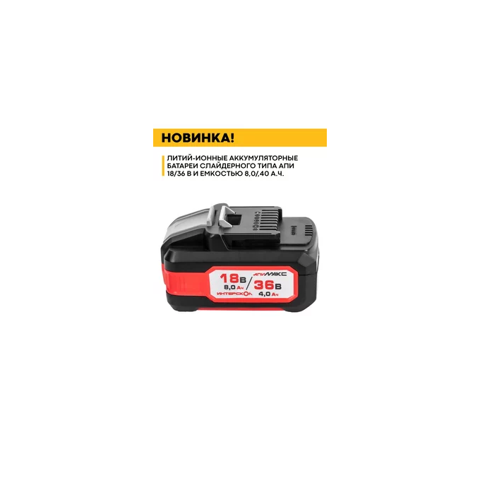 Важнейшая новинка аккумуляторной платформы ИНТЕРСКОЛ – литий-ионные аккумуляторные батареи слайдерного типа АПИ-МАКС 18/36 В емкостью 8,0/4 А∙ч. Их уникальность заключается в способности работать с инструментом, рассчитанным на номинальное напряжение как 18 В, так и 36 В, причем переключение происходит автоматически, полностью исключая вероятность ошибки пользователя. Применяемые здесь высокотоковые аккумуляторы типа 21700 выводят возможности беспроводного инструмента на уровень сетевых аналогов мощностью до 2000 Вт, значительно повышая потенциал его профессионального применения. Данные АКБ полностью совместимы с ранее выпущенными 18-вольтными аккумуляторными моделями ИНТЕРСКОЛ с запатентованным стандартным разъемом АПИ.