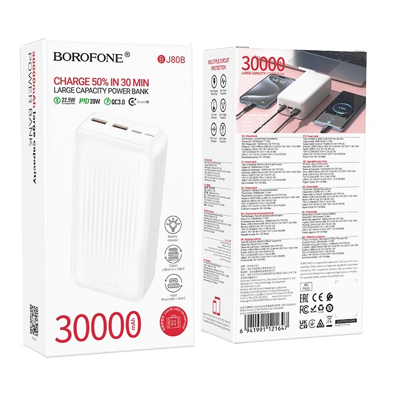 Аккумулятор внешний BOROFONE BJ80B 22.5W+PD20W 30000mAh белый