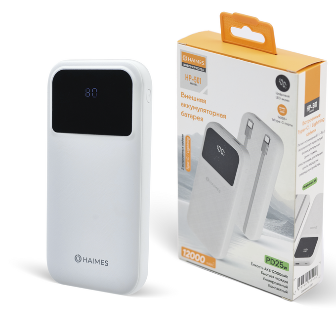 Аккумулятор внешний резервный, быстрая зарядка 25W, 12000 Mah, HAIMES белый