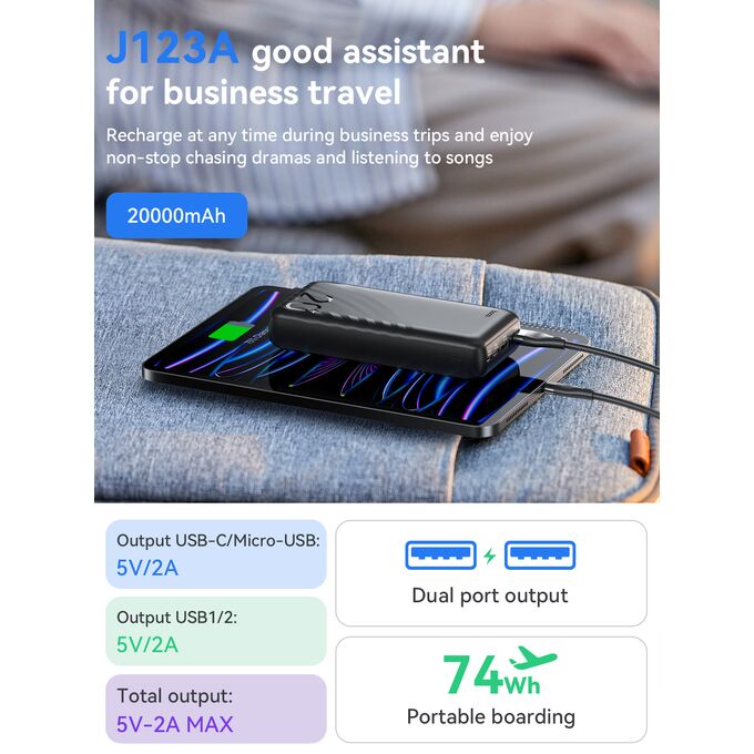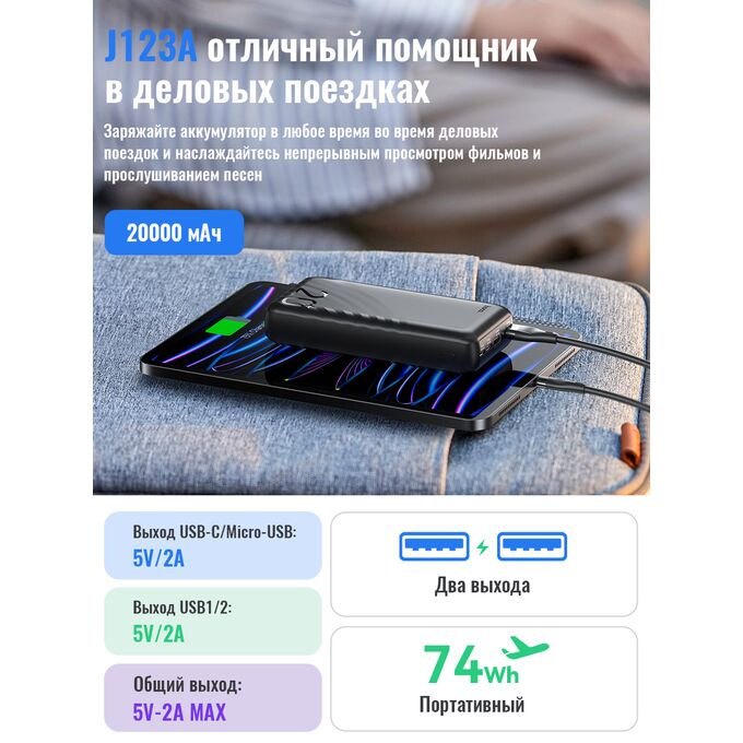 1. Емкость: 20000 мАч, 74 Втч. Номинальная емкость: 11000 мАч (5 В ТИП 2A).