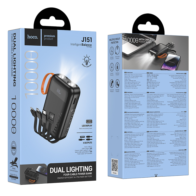 Аккумулятор внешний резервный HOCO J151 Spirit dual lighting four-cable (черный) (10000mAh)
