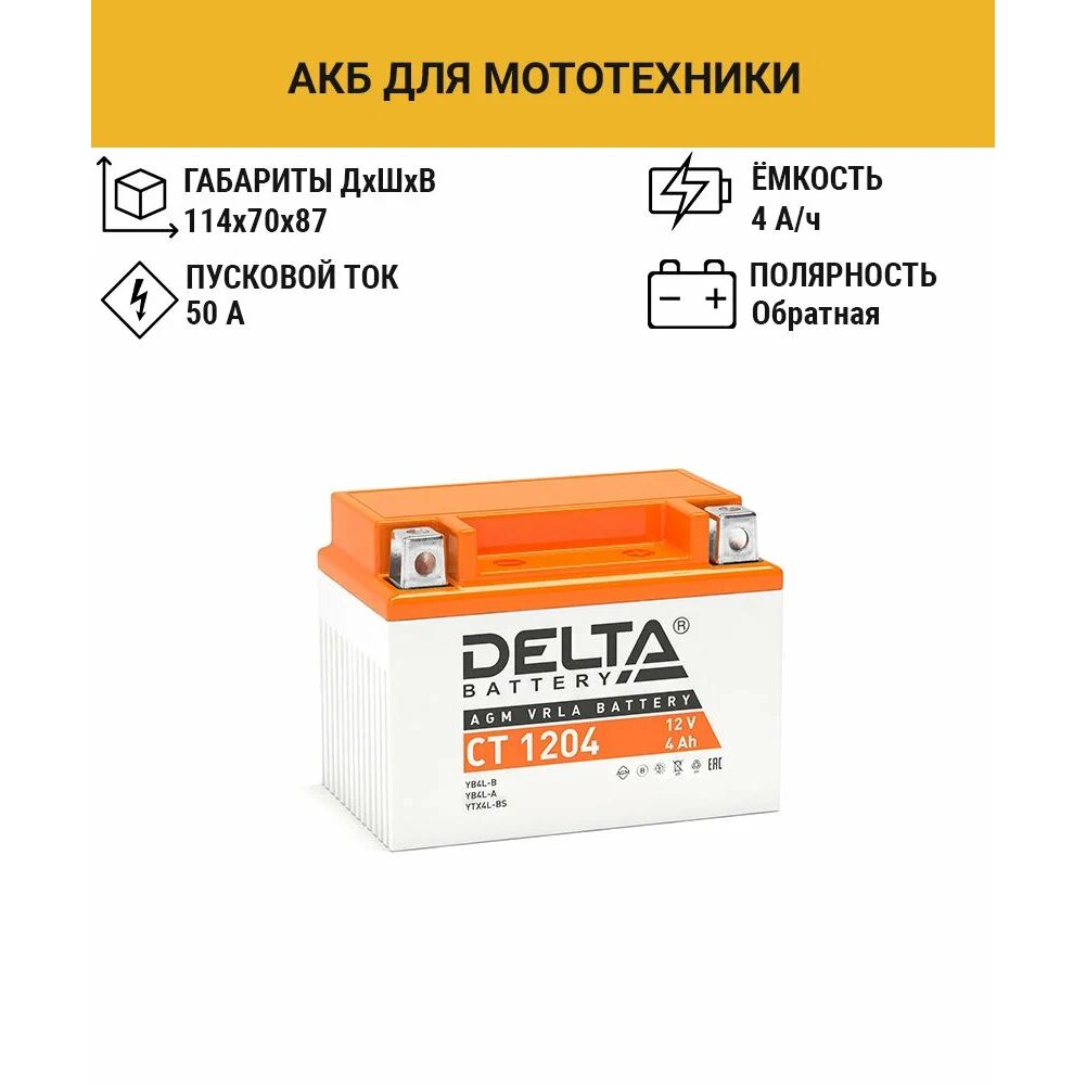 Аккумуляторная батарея Delta CT 1204 соответствует следующему коду YUASA: YB4L-B, YB4L-A, YTX4L-BS. Разработана специально для пуска двигателей мототехники. Изготовлена по технологии AGM (с микропористым заполнителем, пропитанным электролитом) из негорючего ABS пластика. Срок службы аккумулятора достигает 3-5 лет. Высокая стартовая мощность и повышенная энергоотдача. Адаптирован к российским условиям эксплуатации.