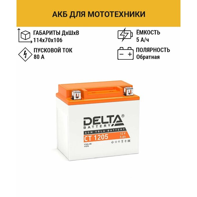 Аккумуляторная батарея Delta CT 1205 соответствует следующему коду YUASA: YTX5L-BS, YT5L-BS, YTZ7S. Разработана специально для пуска двигателей мототехники. Изготовлена по технологии AGM (с микропористым заполнителем, пропитанным электролитом) из негорючего ABS пластика. Срок службы аккумулятора достигает 3-5 лет. Высокая стартовая мощность и повышенная энергоотдача. Адаптирован к российским условиям эксплуатации.