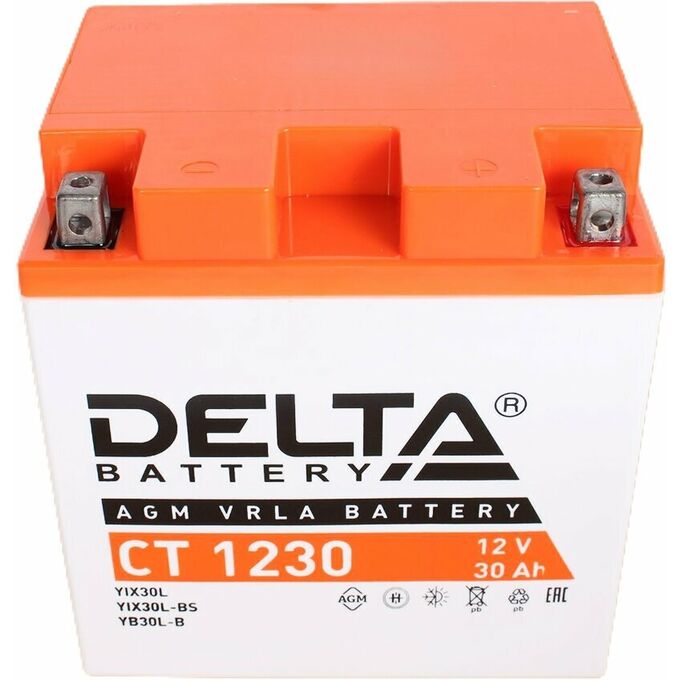 Аккумуляторная батарея Delta CT 1230 соответствует следующему коду YUASA: YTX30L, YТX30L-BS, YB30L-B. Разработана специально для пуска двигателей мототехники. Изготовлена по технологии AGM (с микропористым заполнителем, пропитанным электролитом) из негорючего ABS пластика. Срок службы аккумулятора достигает 3-5 лет. Высокая стартовая мощность и повышенная энергоотдача. Адаптирован к российским условиям эксплуатации.