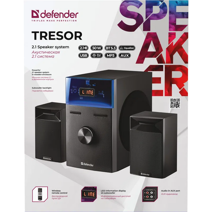 Акустическая система 2.1 DEFENDER Tresor 50Вт, BT/FM/USB/AUX/RC/Light (65092)