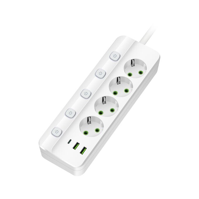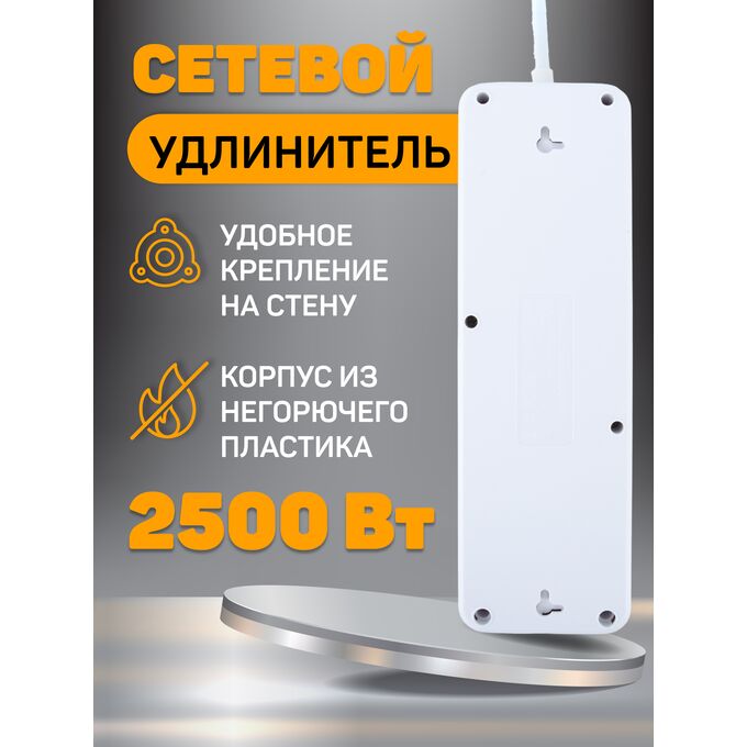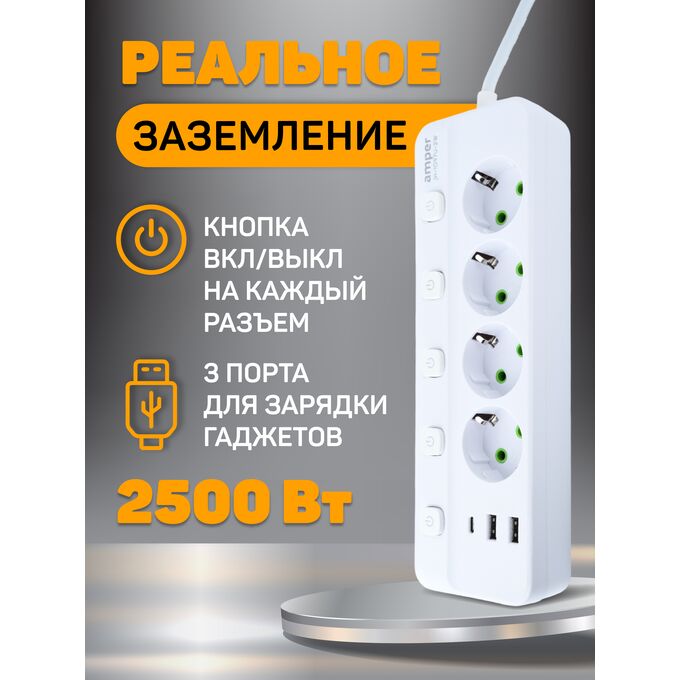 Современный, удобный удлинитель сетевой Amper 2м с 4 розетками, 10А, 2,5кВт и 2 USB портами один из которых Type-C представляет собой идеальное решение для обеспечения безопасного и удобного использования электроприборов в домашних и офисных условиях. Ко всему у удлинителя есть отдельный выключатель на каждую розетку! Этот удлинитель оснащен дополнительными опциями, такими как USB порт, заземление и наличие выключателя, что делает его не только функциональным, но и безопасным выбором. Максимальный суммарный ток на USB портах 2А. Честная длина провода, без колодки. С 4 гнездами/розетками и максимальной нагрузкой в 2500 Вт, он способен обеспечить достаточное количество точек подключения для ваших электронных устройств. Напряжение 220 (+/-10%) и частота сети 50 Гц гарантируют совместимость с большинством электроприборов. Тип входной вилки — евро вилка с заземлением, что обеспечивает дополнительную безопасность. Удлинитель Amper является легким и удобным в использовании, подходящим для любого интерьера.