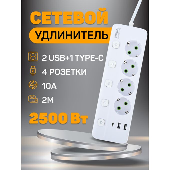 Сетевой удлинитель Amper , 2,0 м, 4 розетки, 3*0,75мм, 10А, 2500 Вт, 2usb, 1Type-C, 4кн, белый