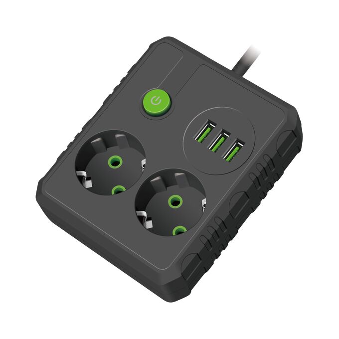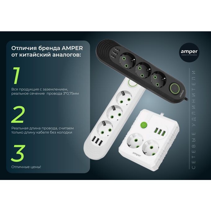 Сетевой удлинитель Amper , 2,0м, 2 розетки, 10А, 2500 Вт, 3usb, черный