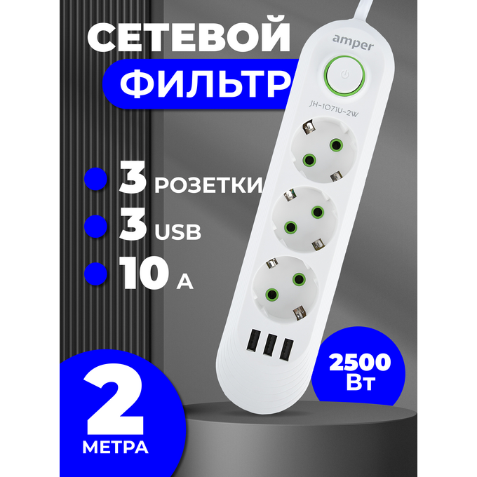 Сетевой удлинитель Amper , 2,0м, 3 розетки, 3*0,75мм, 10А, 2500 Вт, 3usb, белый