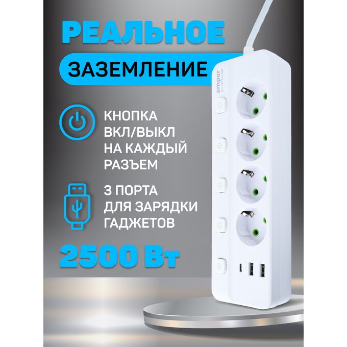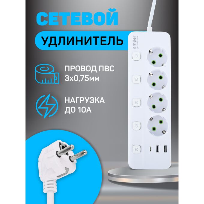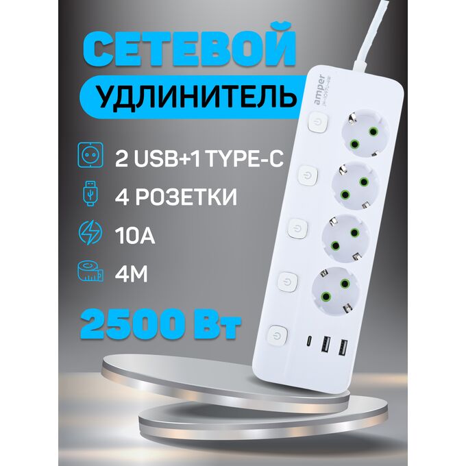 Сетевой удлинитель Amper , 4,0 м, 4 розетки, 3*0,75мм, 10А, 2500 Вт, 2usb, 1Type-C, 4кн, белый