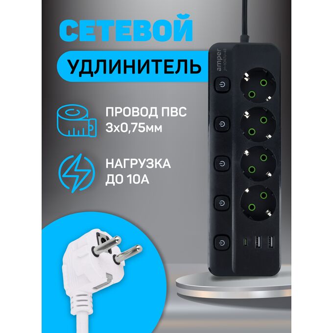 Сетевой удлинитель Amper , 4,0 м, 4 розетки, 3*0,75мм, 10А, 2500 Вт, 2usb, 1Type-C, 4кн, черный