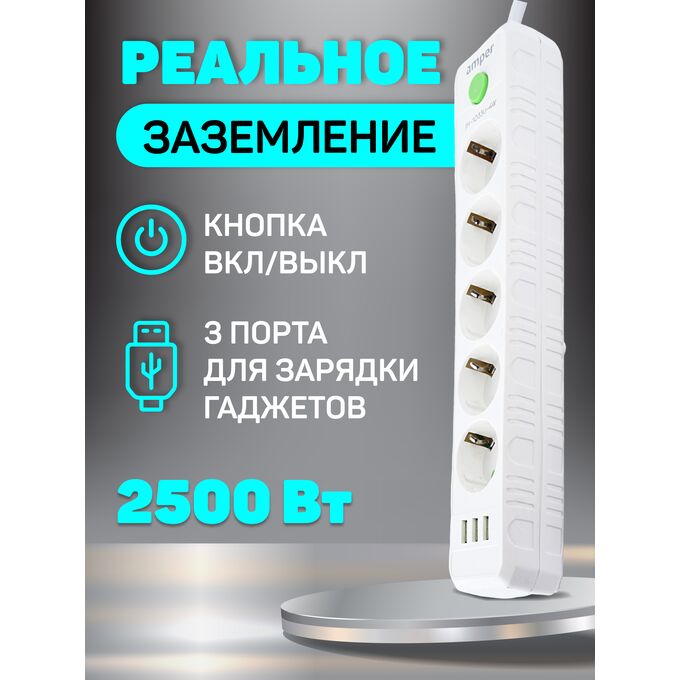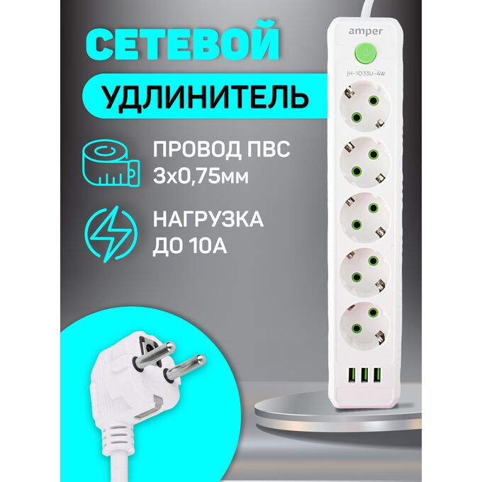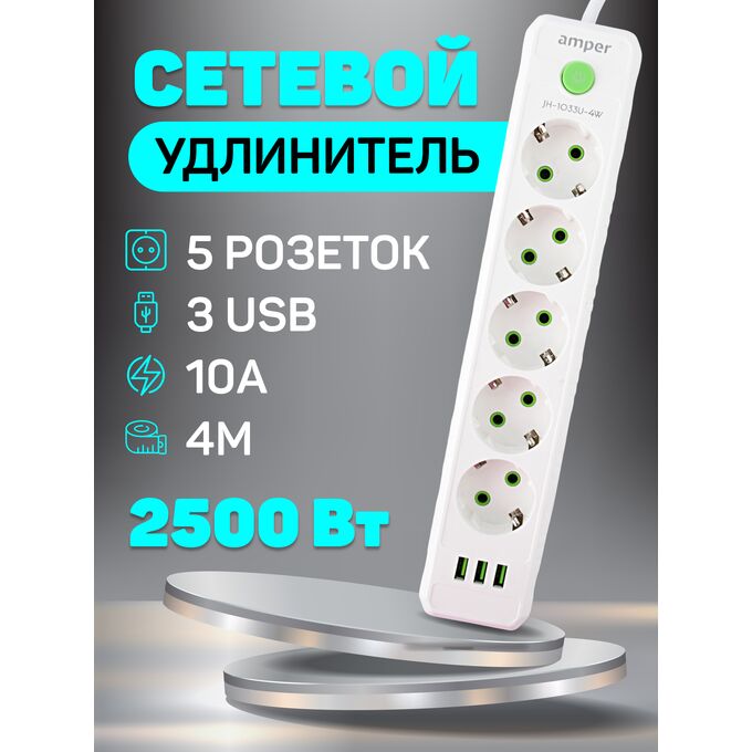 Сетевой удлинитель Amper , 4,0м, 5 розеток, 10А, 2500 Вт, 3usb, белый