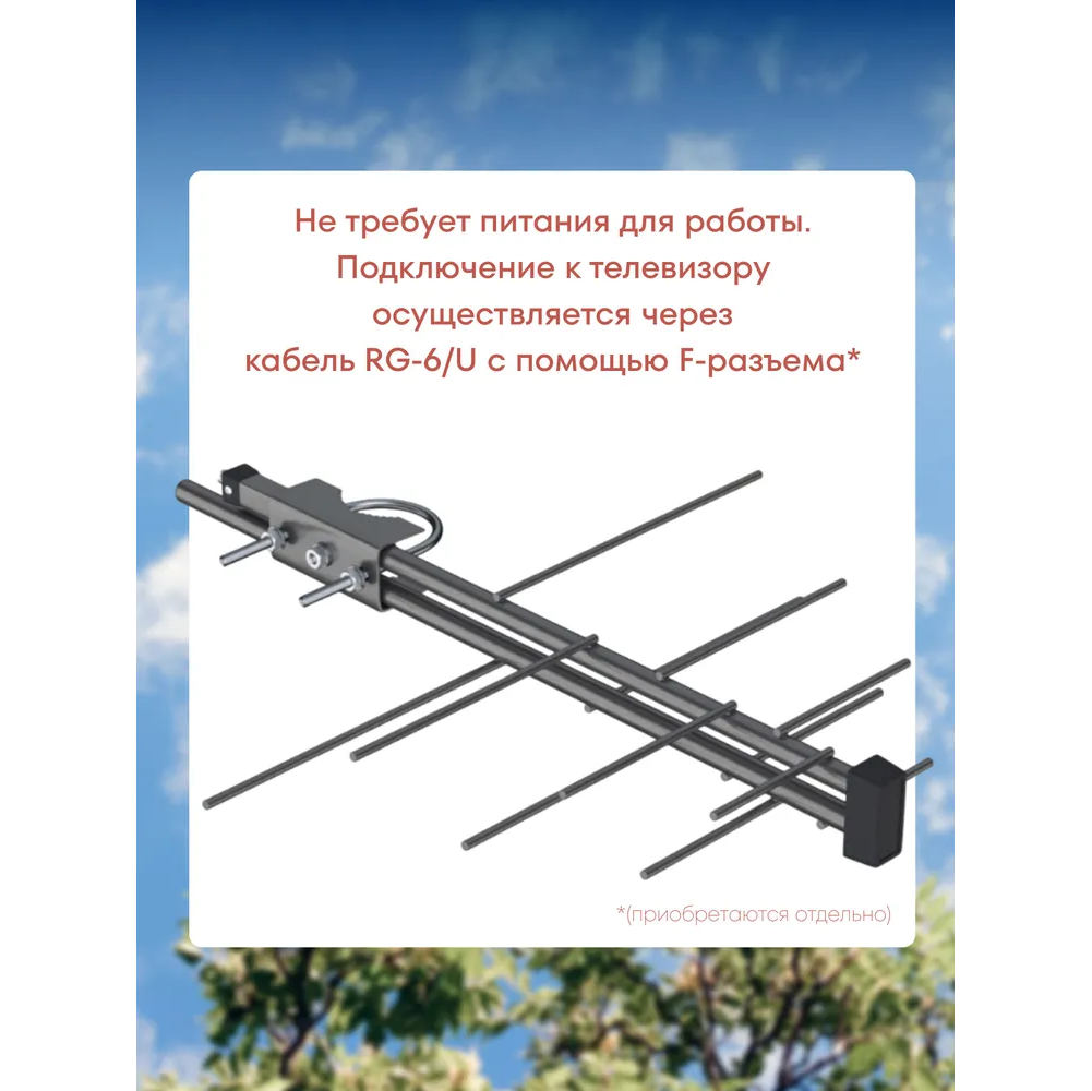 Антенна снабжена усилителем и блоком питания, но для подключения к телевизору дополнительно потребуются коаксиальный кабель, F-коннектор и штекер САТ-Ш, которые не в комплект не включены. Также рекомендуем обратить внимание на акссесуары для ТВ-систем, такие как кронштейны, мачты и делители сигнала на несколько телевизоров.