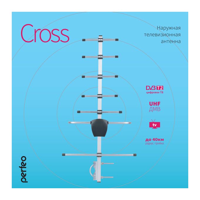 Наружная семиэлементная алюминиевая ТВ антенна CROSS предназначена для приема телевизионных программ в диапазоне 21-69 каналов в цифровом (DVB-T2) формате вещания, а также аналоговых каналов в диапазоне ДМВ. Антенна обеспечивает прием сигналов телевидения в зоне уверенного приема. Дальность и качество приема зависят от места установки приемной антенны, от высоты ее подвеса, мощности телевизионного передатчика, погодных условий и ряда других факторов.
