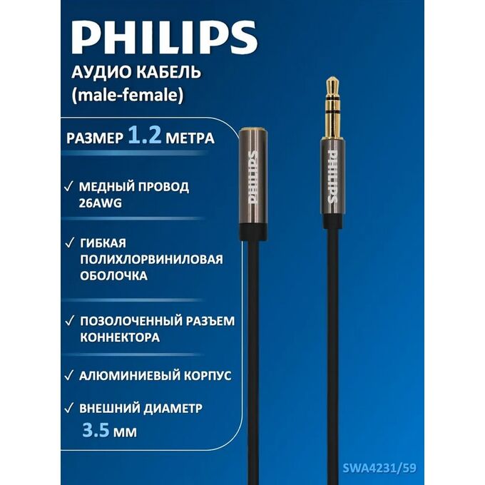 Аудио кабель Philips SWA4231/59, 3.5 мм, (male-female), серый, 1.2 м для передачи звука с одного устройства на другое. С помощью разъема aux вы сможете подключить акустическую систему, наушники или колонки к компьютеру, тв, смартфону или планшету и получить желаемый звук. Достаточная длина прочного кабеля 1,2 метра позволит подключиться к аудиоразъему на системном блоке компьютера или просматривать телевизор в наушниках. Высокое качество коннекторов - проводник из бескислородной меди высокой очистки для наилучшего качества передачи сигнала.