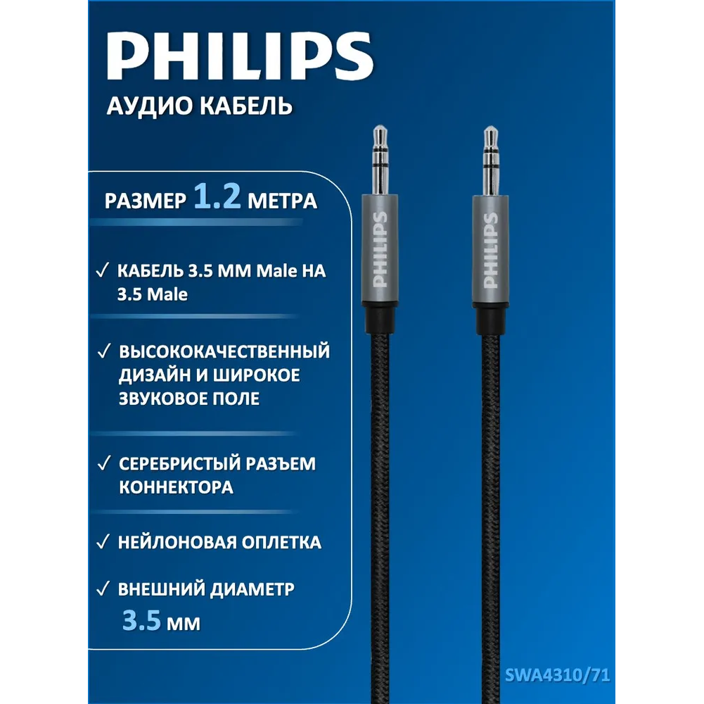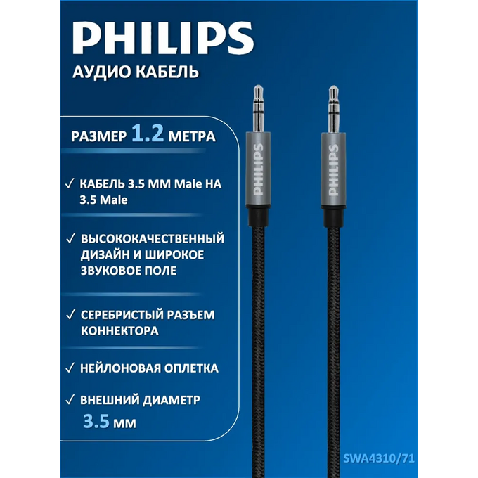 Аудио кабель Philips SWA4310/71, 3.5 мм, в оплетке, серый, 1.2 м - для передачи звука между устройствами с выходом mini jack 3.5. Акустический кабель подходит для смартфонов, планшетов, iPod, iPhone, Samsung, наушников, портативных колонок, автомобильной аудиосистемы и музыкальных центров. Аудио-кабель JACK M - JACK M оптимальной длины 1.2 метра в мягкой нейлоновой оплетке и высоким качеством коннекторов, отлично подходит для различных температурных режимов и остается гибким и прочным во всевозможных условиях и ситуациях. Проводник из бескислородной меди высокой очистки для наилучшего качества передачи сигнала. Позолоченное напыление обеспечивает лучшую проводимость, меньшее сопротивление и окисляемость.