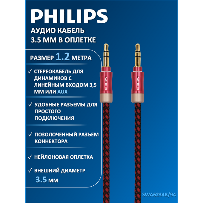 Аудио кабель Philips SWA6234B/94, 3.5 мм, в оплетке, красный, 1.2 м для передачи звука между устройствами с выходом mini jack 3.5. Акустический кабель подходит для смартфонов, планшетов, iPod, iPhone, Samsung, наушников, портативных колонок, автомобильной аудиосистемы и музыкальных центров. Аудио-кабель JACK M - JACK M оптимальной длины 1.2 метра в мягкой нейлоновой оплетке и высоким качеством коннекторов, отлично подходит для различных температурных режимов и остается гибким и прочным во всевозможных условиях и ситуациях. Проводник из бескислородной меди высокой очистки для наилучшего качества передачи сигнала. Позолоченное напыление обеспечивает лучшую проводимость, меньшее сопротивление и окисляемость.