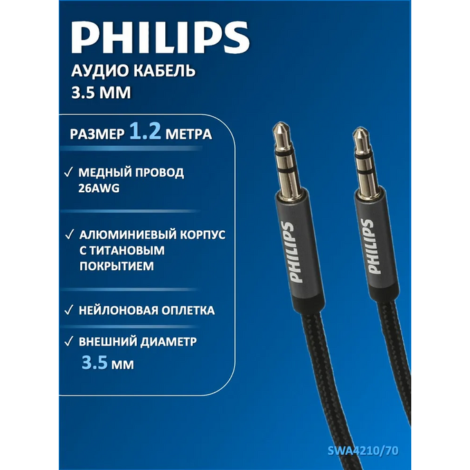 Аудио кабель Philips SWA4210/70, 3.5 мм, в оплетке, серый, 1.2 м для передачи звука между устройствами с выходом mini jack 3.5. Акустический кабель подходит для смартфонов, планшетов, iPod, iPhone, Samsung, наушников, портативных колонок, автомобильной аудиосистемы и музыкальных центров. Аудио-кабель JACK M - JACK M оптимальной длины 1.2 метра в мягкой нейлоновой оплетке и высоким качеством коннекторов, отлично подходит для различных температурных режимов и остается гибким и прочным во всевозможных условиях и ситуациях. Проводник из бескислородной меди высокой очистки для наилучшего качества передачи сигнала.
