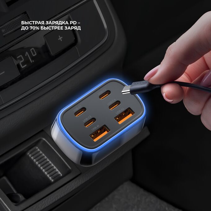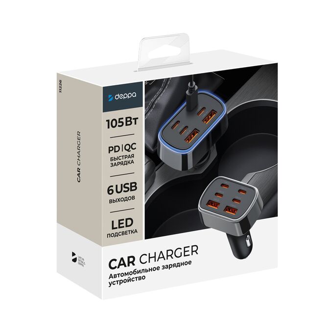 АЗУ 2xUSB-A + 4xUSB-C, PD, QC 3.0, 105Вт, металл, чёрный, Deppa