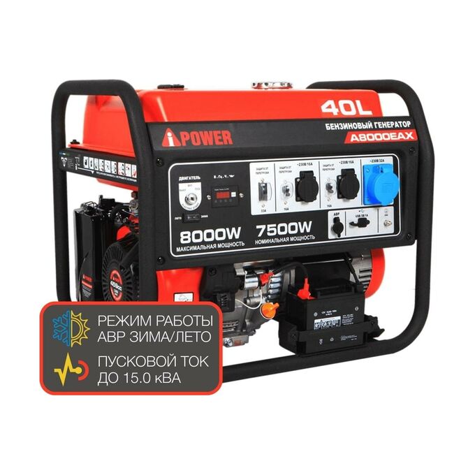 A-iPower A8000EAX оснащен компактным гильзованным 4-тактный OHV-двигателем объемом 459 куб. см с электростартером. На панели управления находится две стандартные розетки 230В/16А, одна силовая розетка 230В/32А, и разъем USB, от которого можно подзарядить смартфон, планшет и другие гаджеты. На цифровой дисплей в режиме реального времени выводятся сведения о работе генератора. Генератор имеет выход для подключения АВР, с возможностью организации источника резервного питания для загородного дома, магазина или кафе.