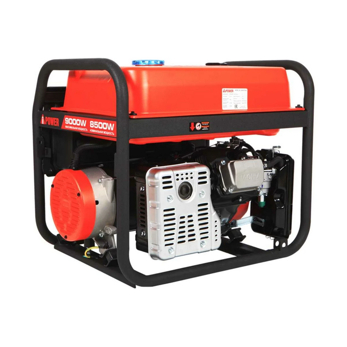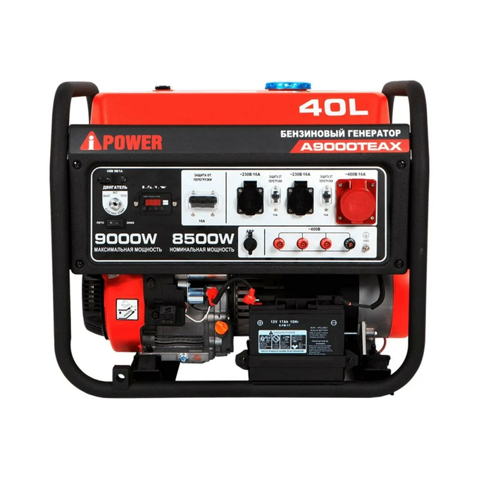 A-iPower A9000TEAX оснащен компактным гильзованным 4-тактный OHV-двигателем объемом 459 куб. см с электрическим стартером. На панели управления находится две стандартные розетки 230В/16А, одна силовая розетка 400В/16А, и разъем USB, от которого можно подзарядить смартфон, планшет и другие гаджеты. На цифровой дисплей в режиме реального времени выводятся сведения о работе генератора. Генератор имеет выход для подключения АВР, с возможностью организации источника резервного питания для загородного дома, магазина или кафе.