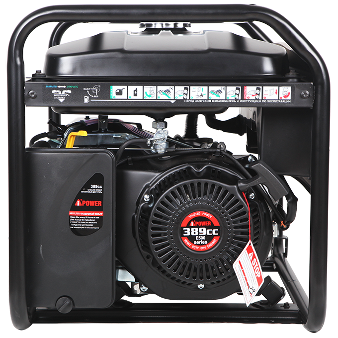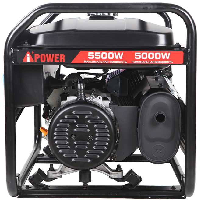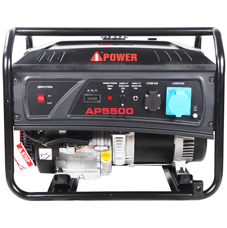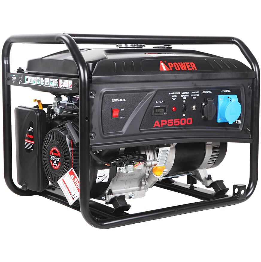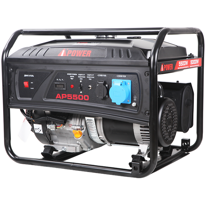 A-iPower AP5500 оснащен компактным гильзованным 4-тактный OHV-двигателем объемом 389 куб. см с ручным стартером. На панели управления находится одна стандартная розетка 230В/16А и одна силовая розетка 230В/32А. Все розетки закрыты пластиковыми крышками