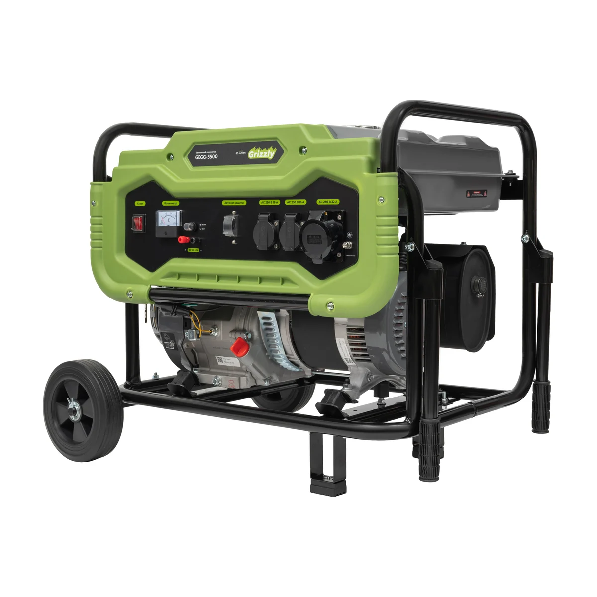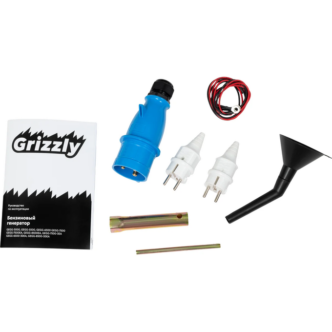 Бензиновый генератор Grizzly GEGG-5500 предназначен для автономного электроснабжения. В комплект входят генератор, свечной ключ, колеса, ручки, комплект вилок и руководство по эксплуатации.