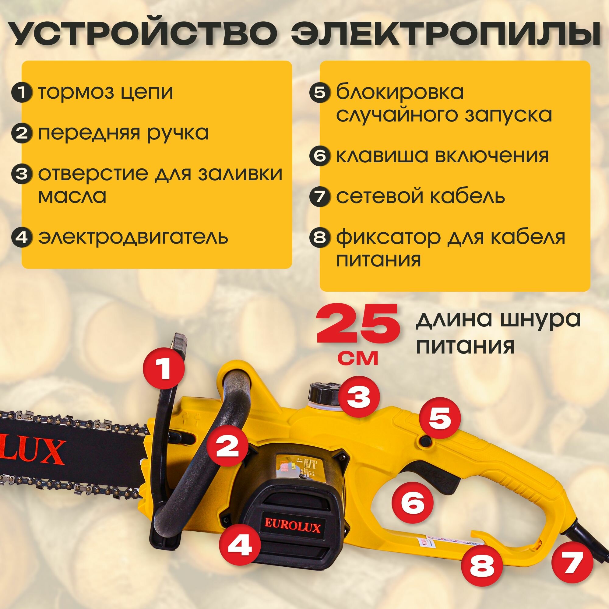 -Безопасность. Автоматический тормоз цепи в виде щитка обеспечивает безопасность работы с электропилой, в первую очередь, защиту ваших рук.