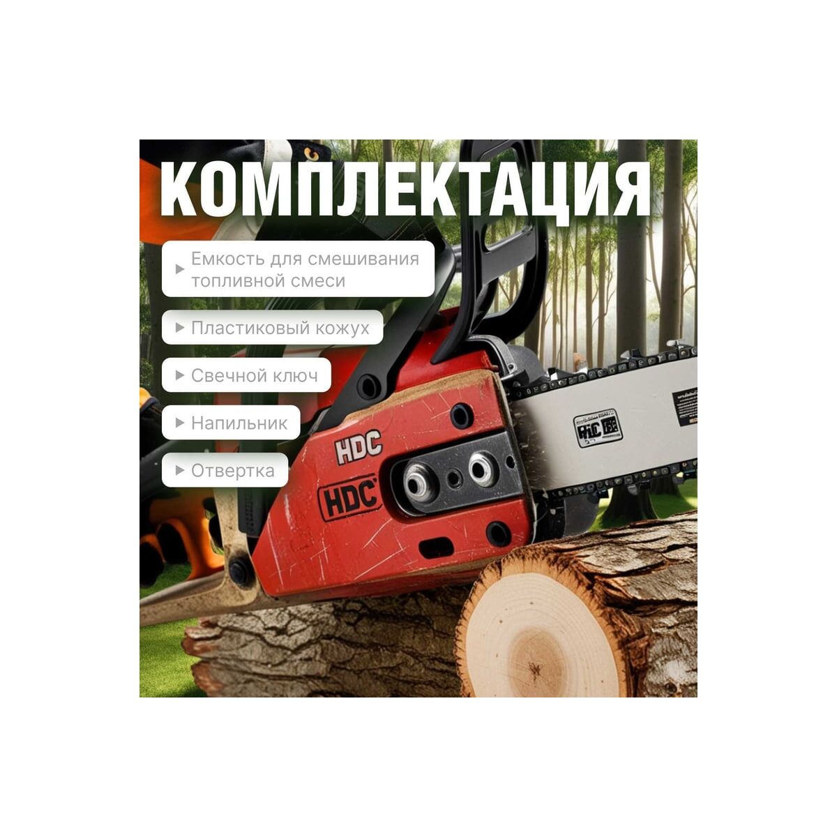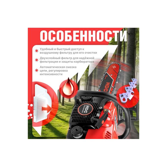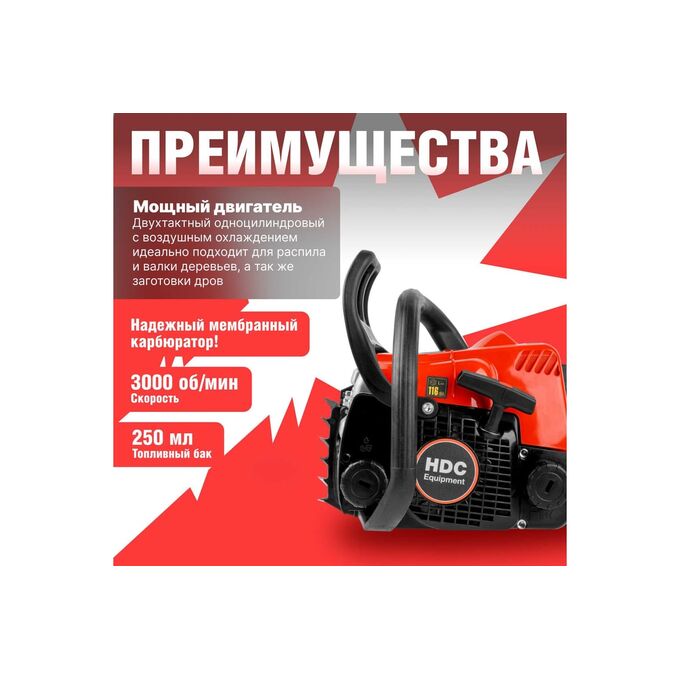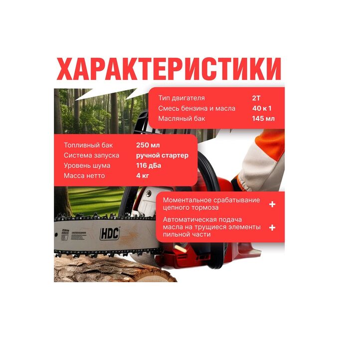 Бензопила HDC HD-C180 (HD6210-1) - легкая сбалансированная бензиновая цепная пила отлично подходит для ухода за садовым участком и заготовки дров. Топливо, смесь бензина и масла: 40 к 1. Уровень шума 116 дБа.