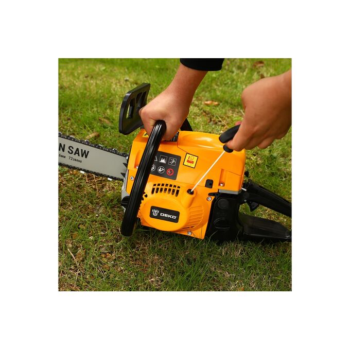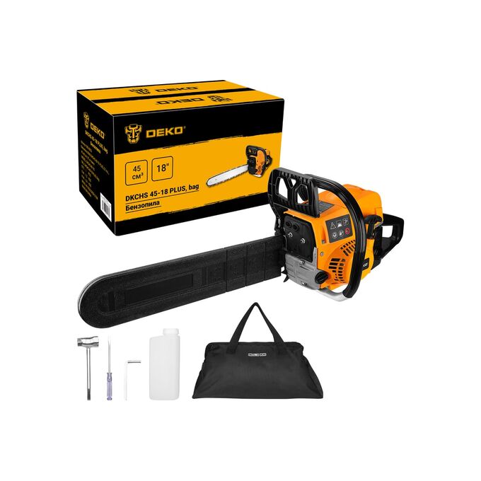Бензопила DEKO DKCHS 45-18 PLUS, 3,1 л.с., 45 куб.см, 18", в сумке - мощный и надежный инструмент для распила древесины, подойдет для ухода за деревьями на участке, а также для заготовки дров. Защитный щиток является одновременно защитой для рук оператора и тормозом цепи, что не позволяет нанести травмы при соскальзывании и обрыве оснастки. Эргономичная задняя рукоять обеспечивает крепкий хват и надежное удержание инструмента.