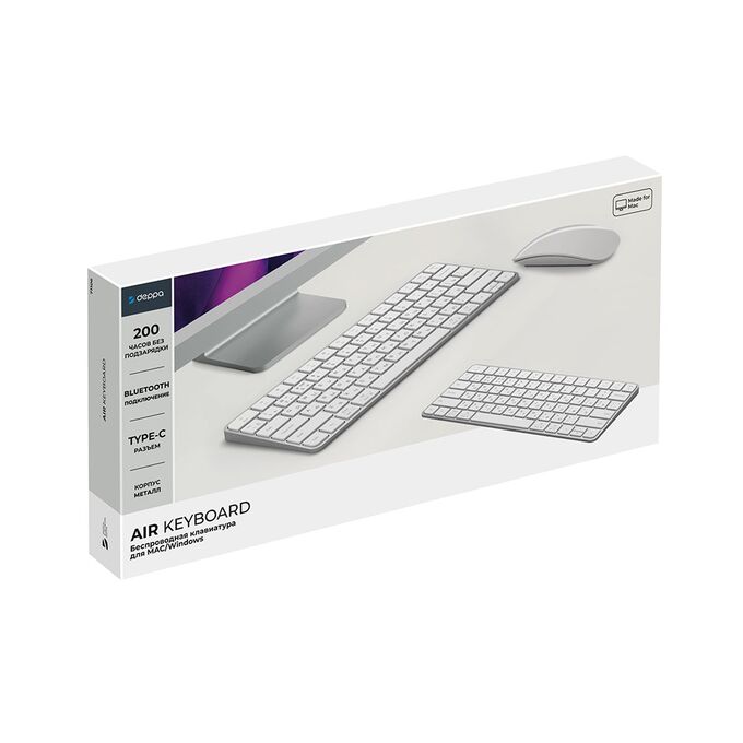 Беспроводная клавиатура Air Keyboard для MAC, Windows, 500 мАч, алюминий, белый, Deppa