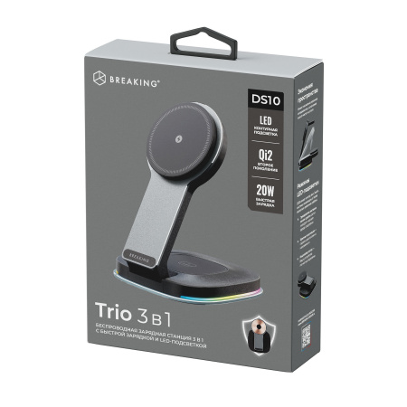 Беспроводная зарядная станция 3 в 1 BREAKING DS10 Trio — это удобный и стильный аксессуар, который может одновременно заряжать смартфон, наушники и часы с поддержкой Qi. Конструкция станции позволяет удобно организовать пространство на рабочем столе. При подключении устройства к зарядной станции загорается световой индикатор. Цвет индикатора меняется в зависимости от того, какое устройство подключено. Поверхность станции выполнена из силикона, поэтому она не будет скользить по столу и царапаться. Беспроводная зарядная станция поддерживает технологию быстрой зарядки
