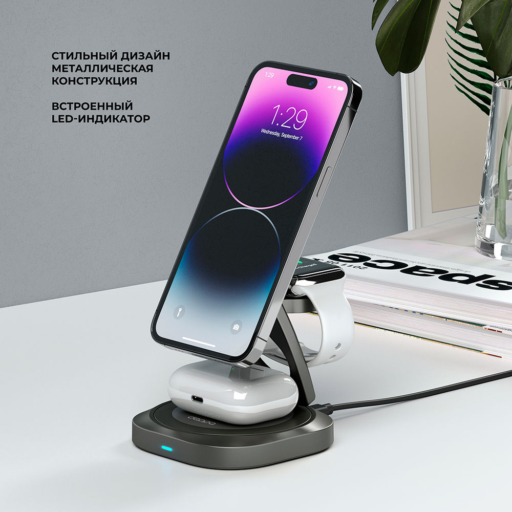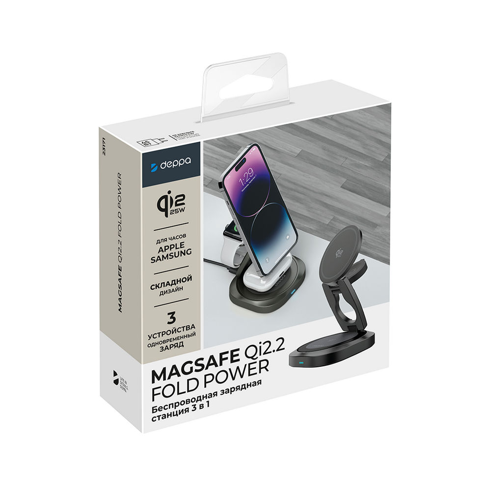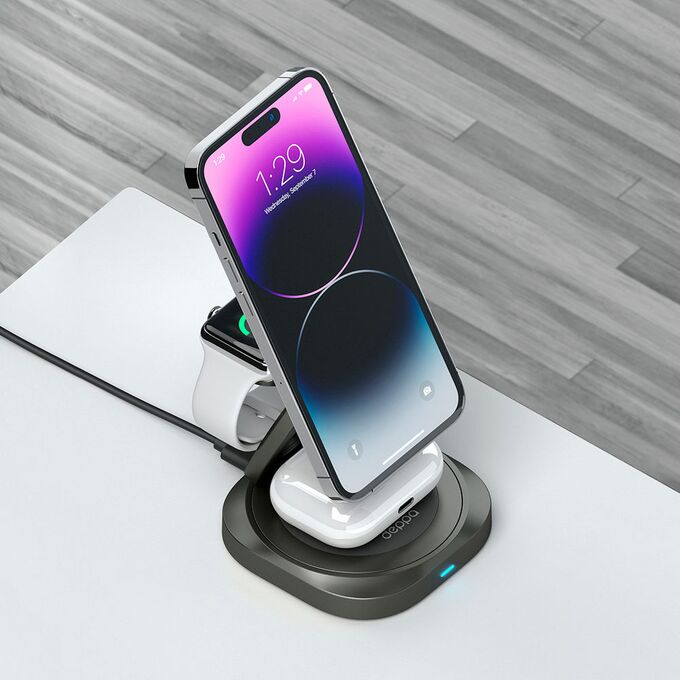 Беспроводная зарядная станция 3 в 1 QI2.2 Fold Power, Серая, Deppa