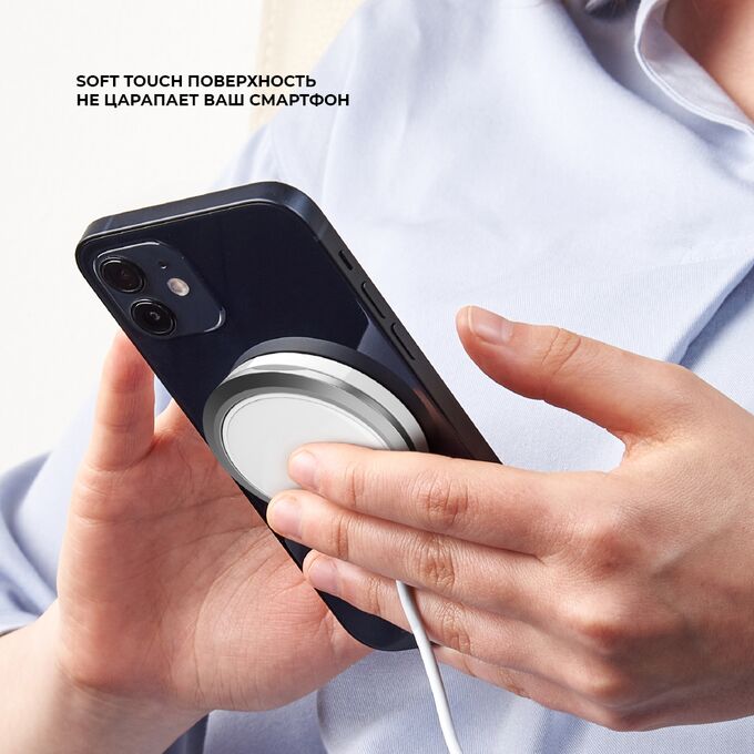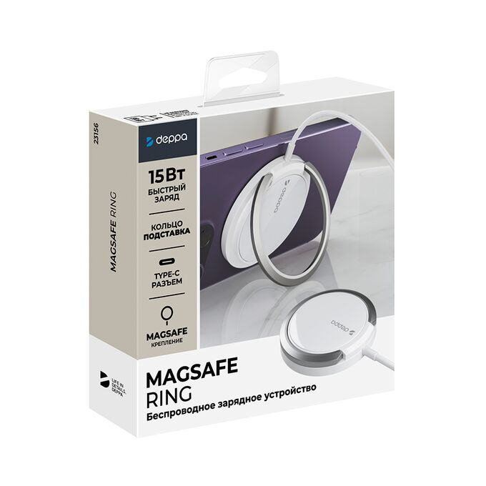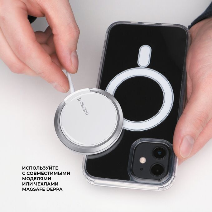 Беспроводное зарядное устройство MagSafe от Deppa позволяет заряжать смартфон на максимальной допустимой мощности до 15Вт. Soft Touch поверхность защищает от царапин на задней крышке, а стильный дизайн подойдёт к любому интерьеру. Удобная подставка-кольцо для iPhone c Magsafe креплением. Имеет встроенную защиту от перегрузок, короткого замыкания и перегрева. Совместим с iPhone12 и более новыми моделями.