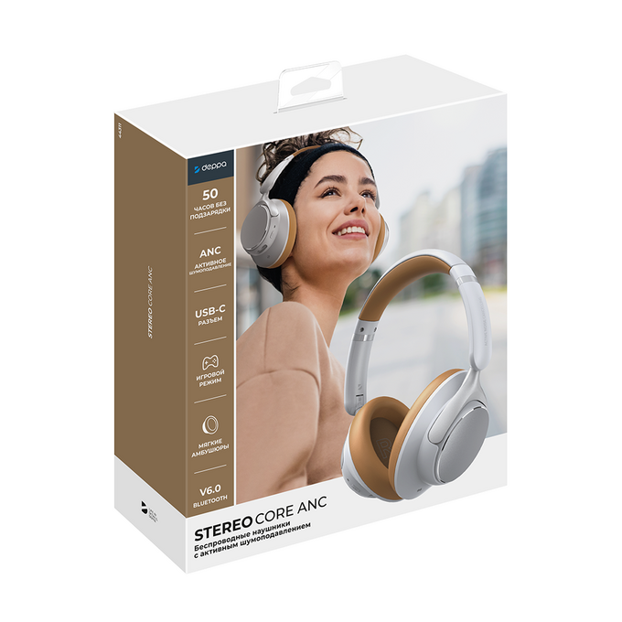 Беспроводные накладные наушники Stereo Core ANC, BT 6.0, 400 мАч, белый, Deppa