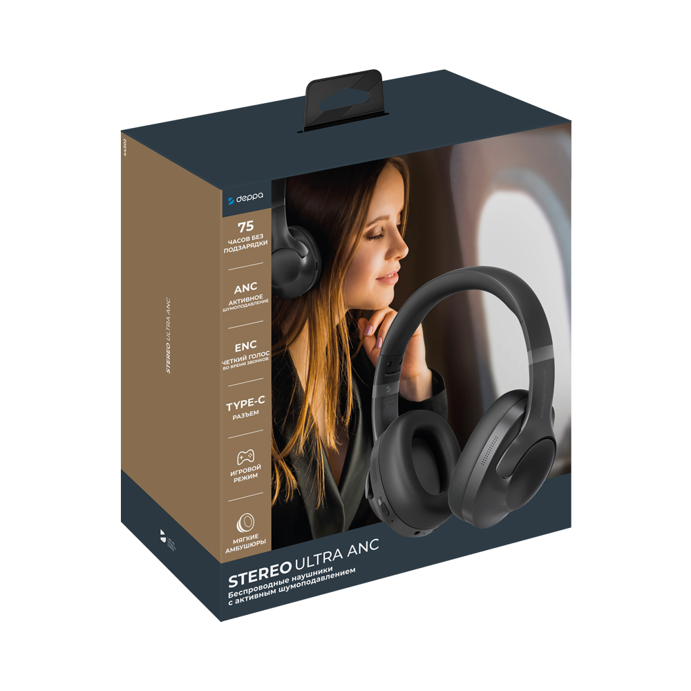 Беспроводные накладные наушники Stereo Ultra ANC, BT 5.4, ANC/ENC, 500мАч, черный, Deppa