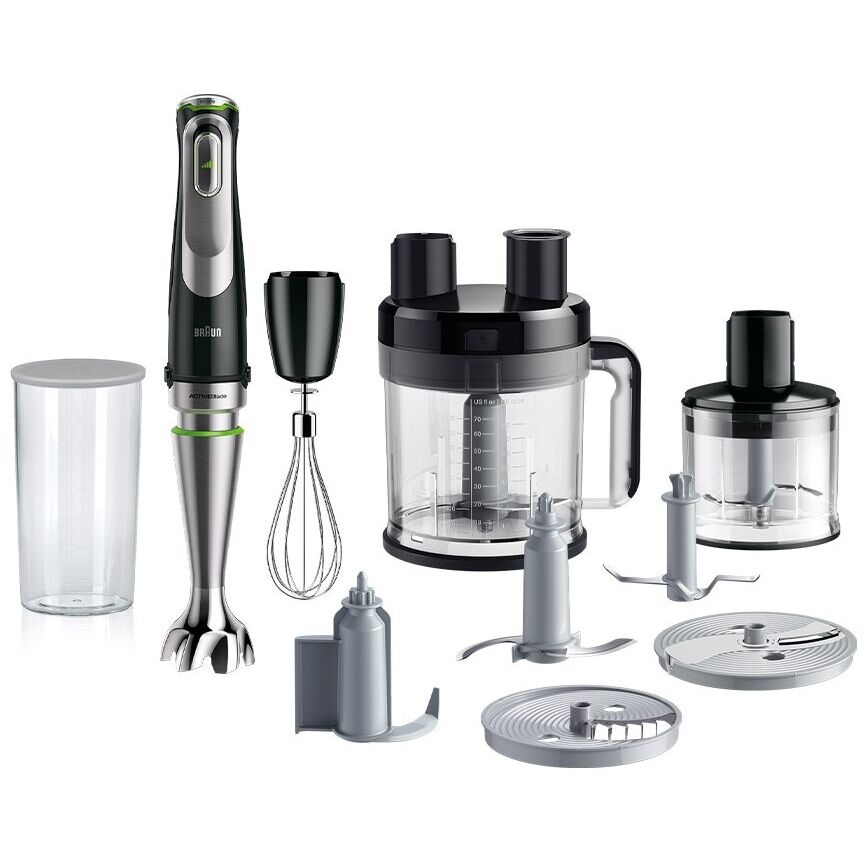 Система EasyClick, управление Smart Speed, технологии ActiveBlade и PowerBell Plus; в комплекте 13 насадок, насадки можно мыть в посудомоечной машине, объем комбайна 2 л, прорезиненная ручка