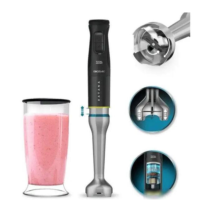 Погружной блендер Cecotec Katana 12 Jar B выполнен из качественных материалов и работает от сети с мощностью 1500 Вт, что обеспечивает быстрый и эффективный процесс смешивания. Он оснащён системой «TotalDestroy», которая использует двойные лезвия для более тщательного измельчения продуктов. Благодаря режиму «Турбо» вы можете быстро увеличить мощность для сложных задач. Ножи с титановым покрытием «BlackTitanium» служат дольше и не ржавеют. Лёгкое управление позволяет выбрать нужный режим или скорость без усилий. В комплект входит мерный стакан на 800 мл, венчик для взбивания и насадка для смешивания, что расширяет возможности использования. Корпус выполнен из металла и пластика, а цвет — серебристый и черный. Защита от брызг «BellShield» помогает содержать рабочие места в чистоте и безопасности. Также устройство не предусматривает возможность колки льда и работы со смартфонами, что не мешает эффективно выполнять основные задачи по приготовлению еды.