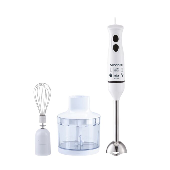 Погружной блендер Viconte VC4449 900 W, Погружной блендер, мощность 900 W, современный эргономичный дизайн, пульсовый режим работы, 2 скорости, лезвия из нержавеющей стали, металлическая нога блендера, венчик для взбивания, чаша с ножом для рубки и измельчения, 500 мл; автоматическая блокировка при неправильно установленной насадке, удобство и простота в обращении и чистке.