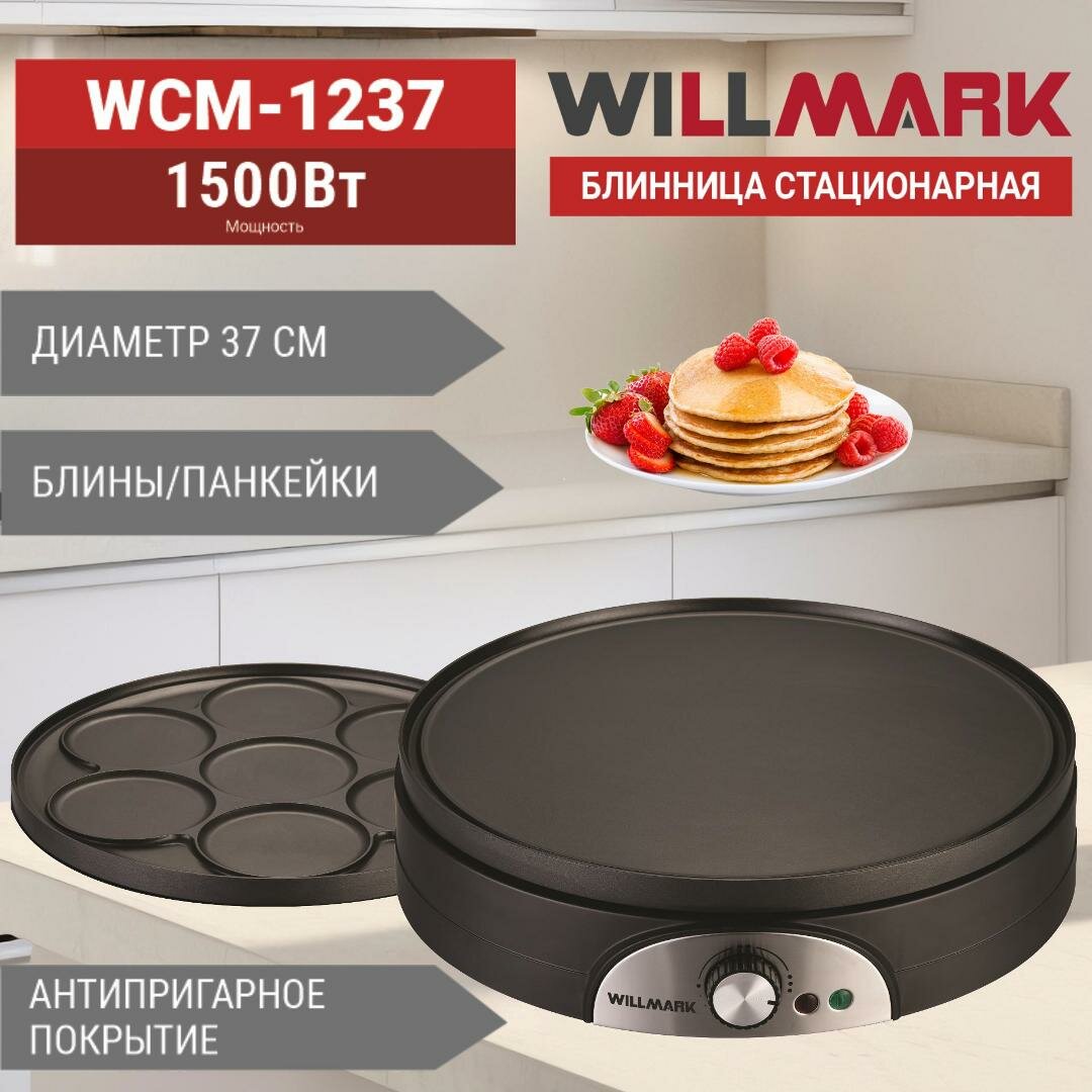 Блинница WILLMARK WCM-1237 – отличный помощник на кухне, имеет съемную панель, 2 в 1, можно приготовить блины и панкейки. Обладает элегантным внешним видом и проста в использовании. Корпус модели выполнен из высокопрочного пластика со вставками из нержавеющей стали. Антипригарное покрытие. В комплект входит кулинарная лопатка и Т-образный распределитель для теста.Блинница оснащена термостатом, поэтому вы можете в любой момент отрегулировать желаемую температуру. Устройство имеет индикатор нагрева, который подскажет, когда рабочая поверхность достигает выбранной температуры.