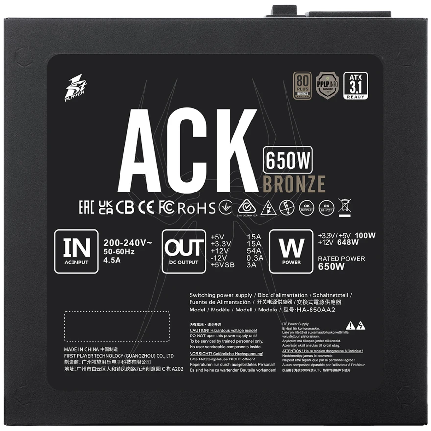 Блок питания 1STPLAYER Ack Bronze 650W Black (HA-650AA2) / ATX 3.1, APFC, 80 PLUS Bronze, Double Forward, 140mm fan, non-modular / HA-650AA2