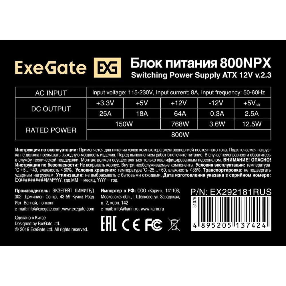 Блок питания ExeGate 800NPX EX292181RUS-PC 800W (ATX, PC, 12cm fan, 24pin, 2x(4+4)pin, 2xPCI-E, 5xSATA, 3xIDE, black)