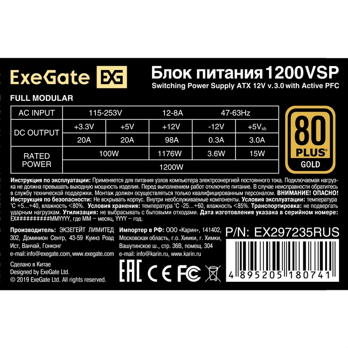 Блок питания Exegate 1200VSP FC 80 Plus Gold EX297235RUS