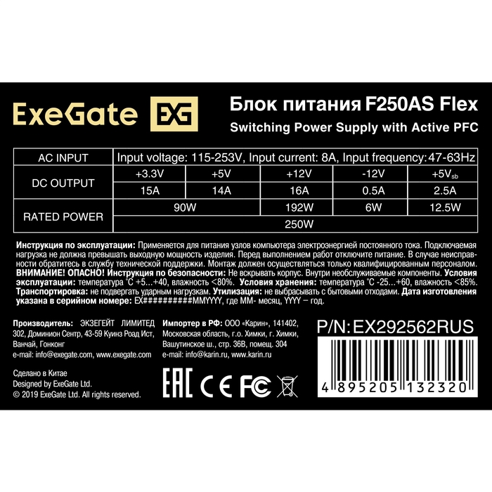 Блок питания ExeGate F250AS EX292562RUS 250W (Flex ATX, for ITX case, APFC, КПД 80проц. (80 Plus), 4cm fan, 24pin, (4+4)pin, PCI-E, 3xSATA, 2xIDE)